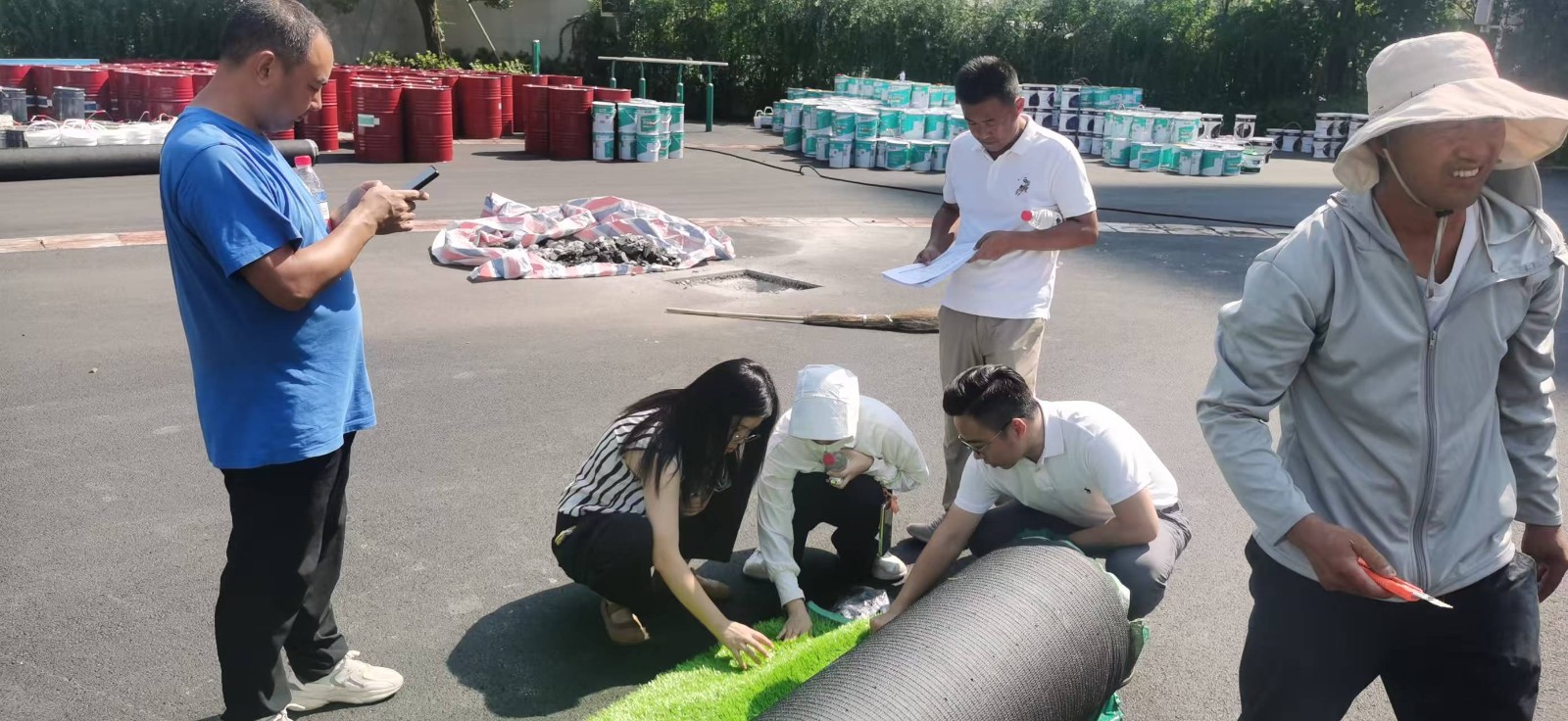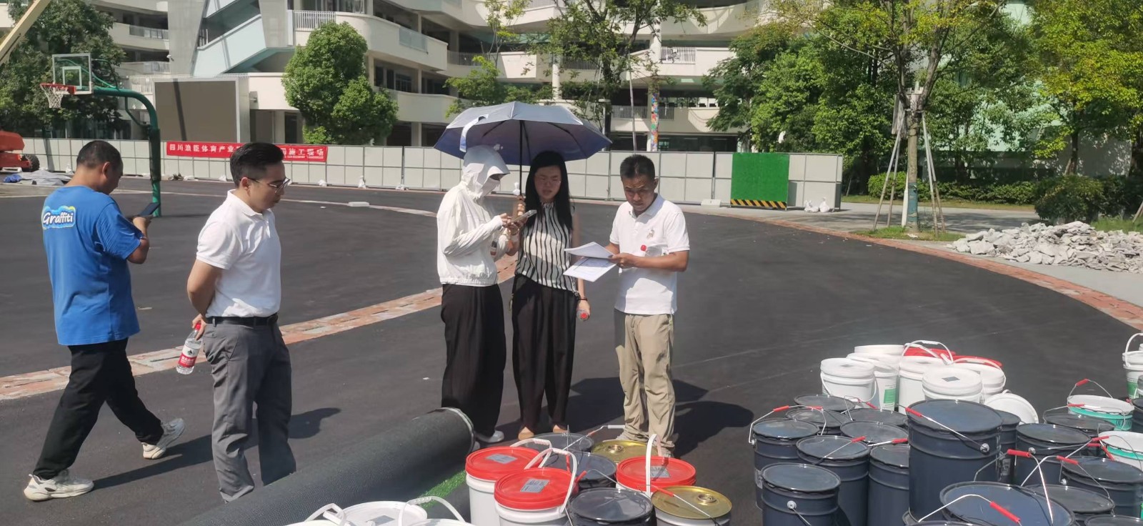 2025年7月28日天府新区麓湖小学运动场维修改造工程塑胶跑道材料、硅Pu材料、足球场人造草坪,建设单位对进场材料进行现场查验